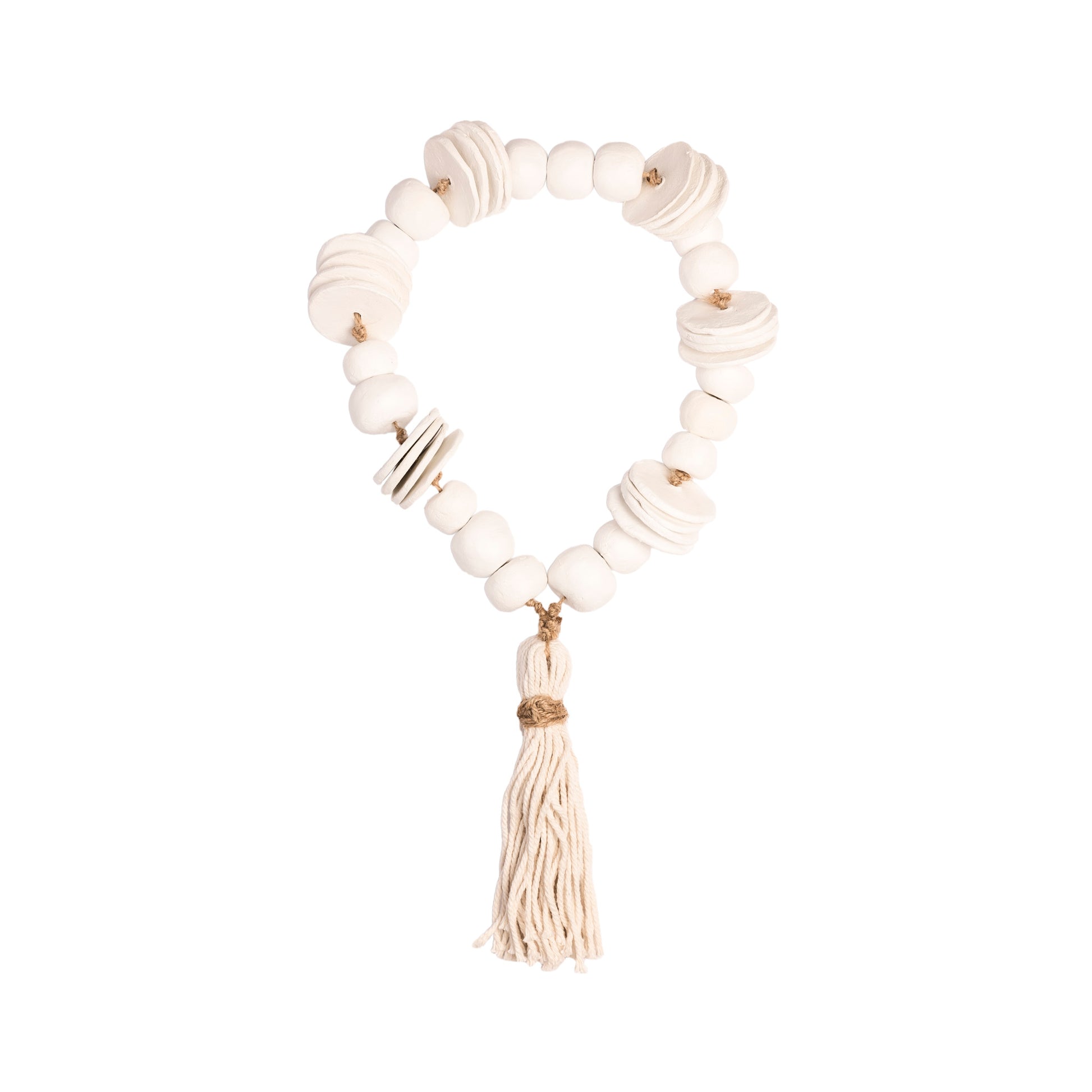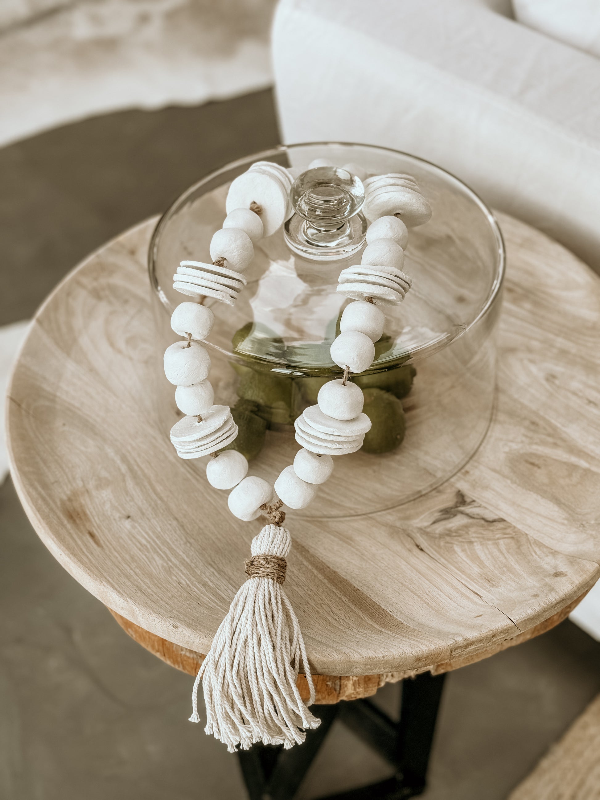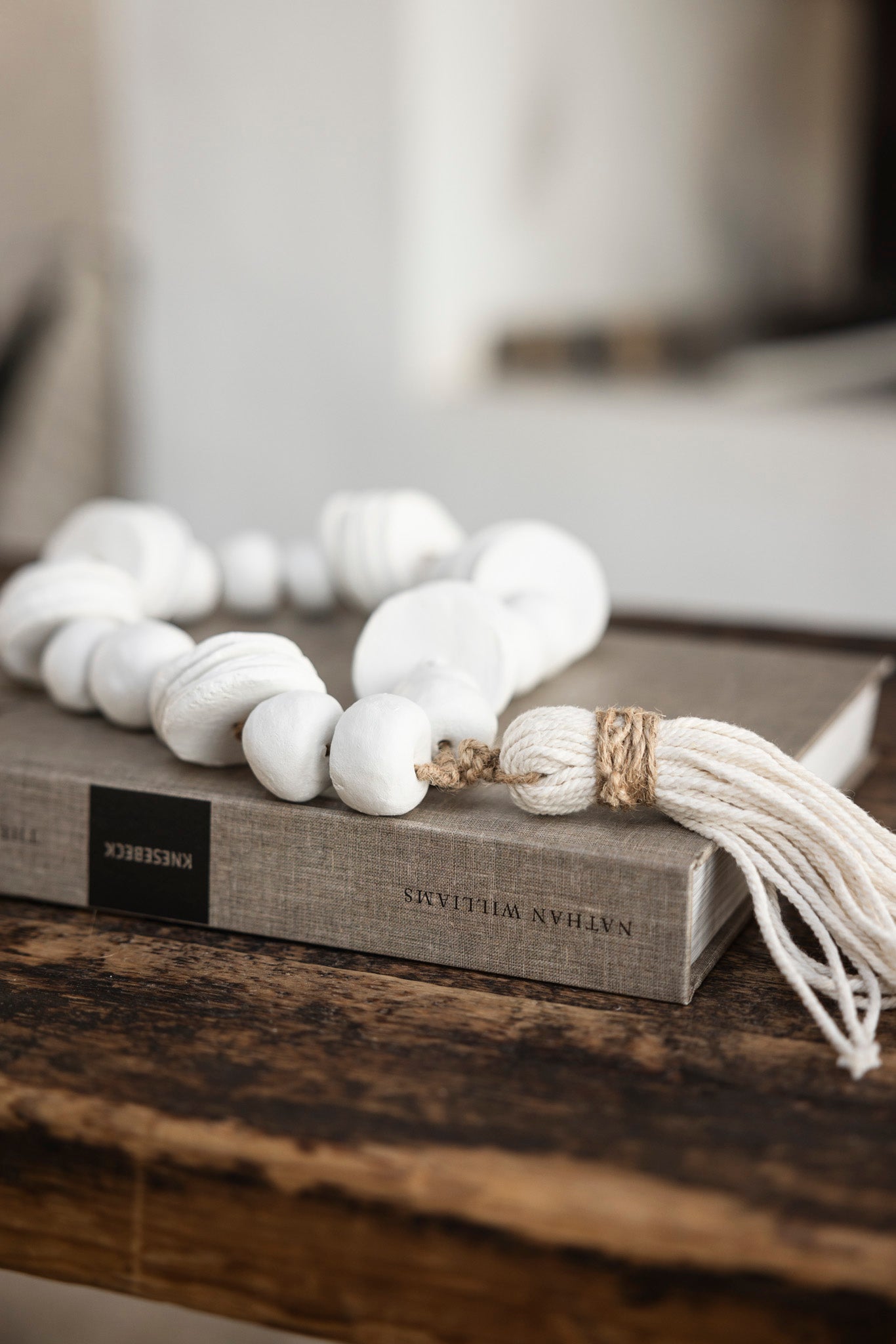 Handmade in Yzerfontein, this beautiful decor piece has been crafted with nothing but love. This mixed clay garland is made of round clay beads and clay discs with a cream woven tassel.