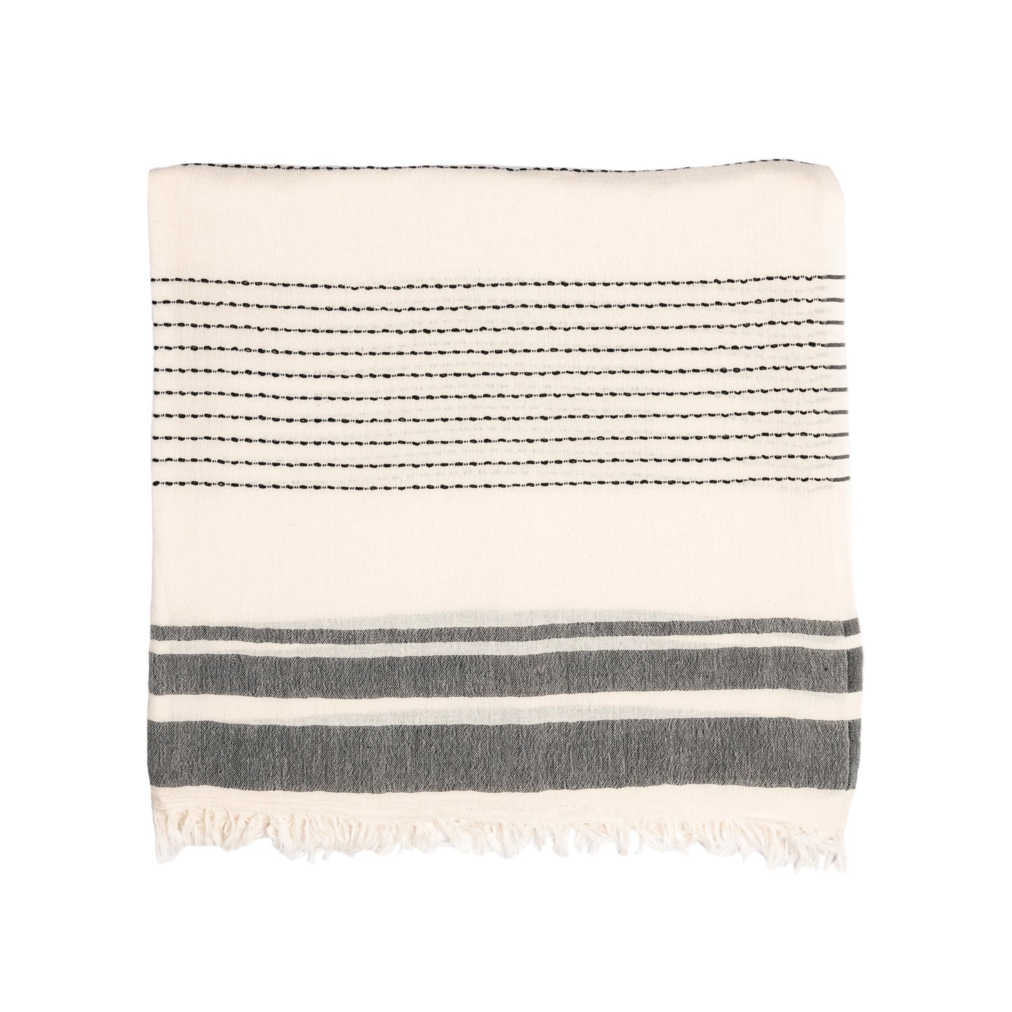 The ultimate beach sarong, our flat-woven and lightweight sarong stands out as one of our top-sellers. The Sophia Beach Sarong features a soft charcoal or light blue/grey dotted stripe pattern with a solid charcoal trim that gives it a subtle monochrome feel. Crafted from premium 100% cotton, these beautiful sarongs are very versatile, doubling up as a lightweight summer throw to drape over your shoulders.